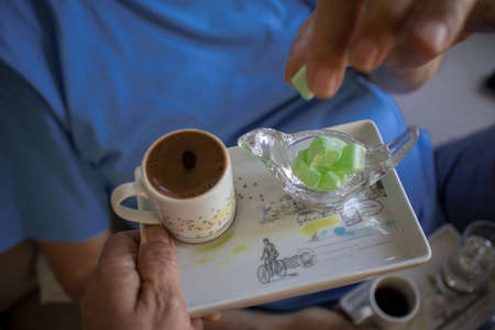 Locum and turkish coffee in outdoor cafe. Direct sunset light. Shallow DOF and lightly toned