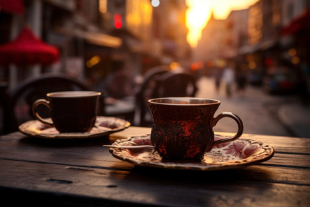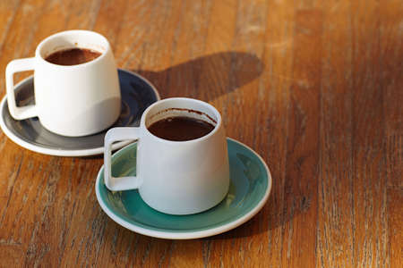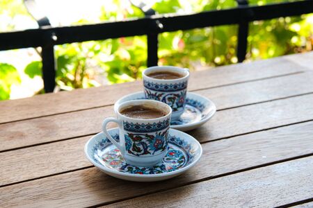 Traditional Turkish coffee on the wooden table in outdoor restaurant