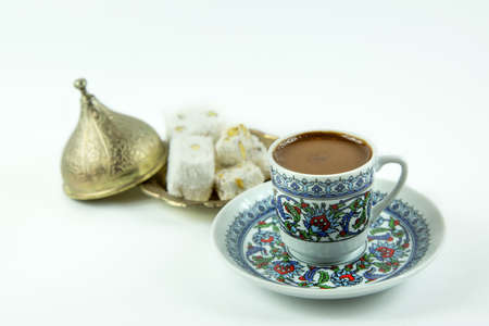 Cup of Greek - Turkish coffee isolated on white background with sweety delight