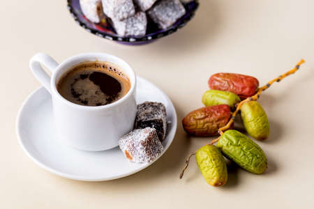Turkish Delight Lokum on Small Bowl and Cup of Turkish Coffee on Yellow Background Tasty Eastern Sweets Dessert Horizontal