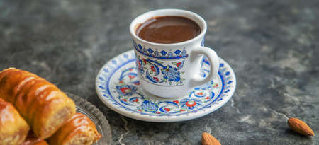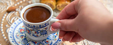 A cup of Turkish coffee and baklava. Selective focus. drink.