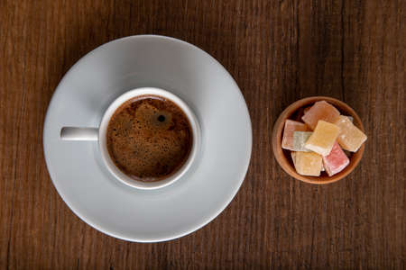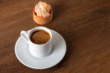 Traditional Turkish delight and Turkish coffee on a wooden background
