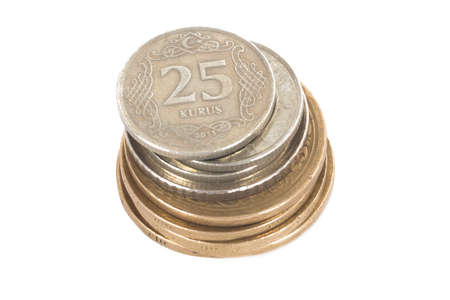Coins on the Turksh Lira banknotes of various color, pattern and value on white background