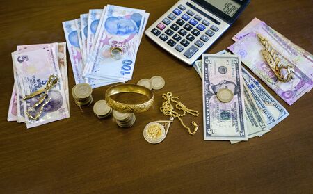 Close up Turkish lira banknotes and golds on grey background
