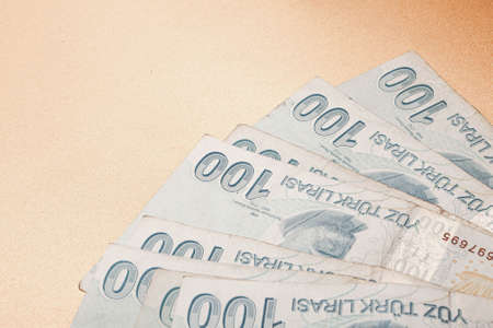 Turkish money, closeup of hundreds of Turkish lira banknotes on light background. money background or concept surface photo with lira banknotes which is the currency of Turkey or Turkiye. finance concept