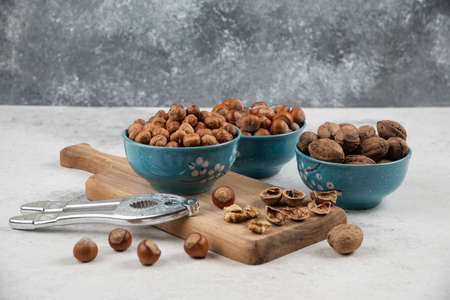 Bowls of walnuts, hazelnuts and kernels on wooden cutting board