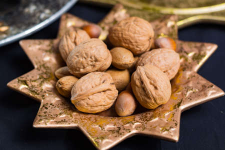 Golden Christmas plate with variety of nuts close up