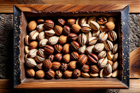 assorted organic nuts in a wooden bowl