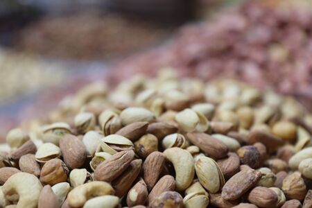 Backround of mixed roasted nuts sold at local city market