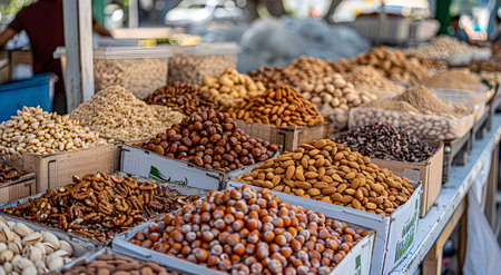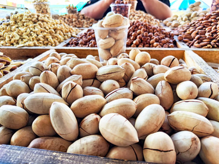 Many types of nuts are on display at a market. Large nuts are the main focus in the foreground with other nuts in the background.