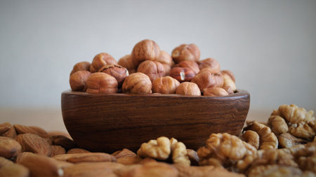 hazelnut and almonds on a table and bowl healthy food a balanced diet