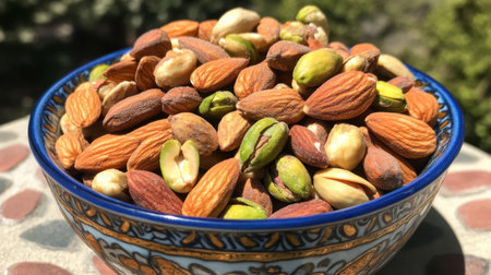 Almonds, pistachios, and walnuts arranged on a dining table, offering a nutritious and wholesome snack choice