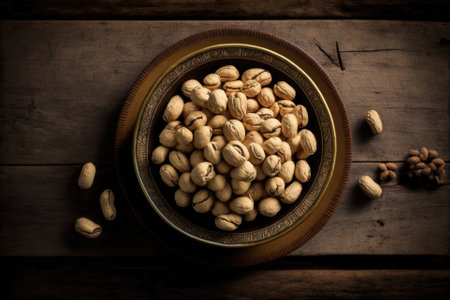 a person snacking a mixture of nuts (peanuts, pistachios, almonds, walnuts, hazelnut, cashew) in a bowl from top view with black background with copy space
