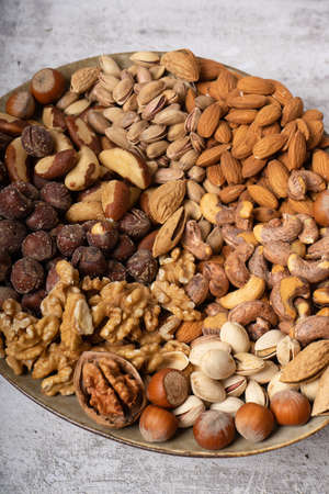 top view of assorted different types of nuts on a plate