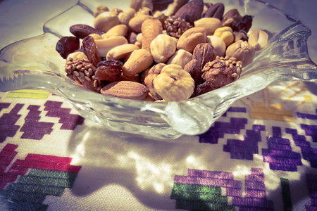 Mix of nuts in a glass bowl on the table. Toned.