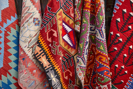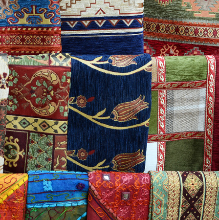 Handmade carpets hanging on a wall at a street oriental market or bazaar in Istanbul, Turkey
