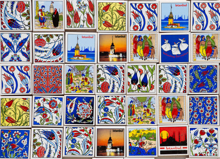 ISTANBUL, TURKEY - JULY 14, 2015 : Colorful magnet souvenirs at a souvenir shop. They are a popular souvenir for tourists