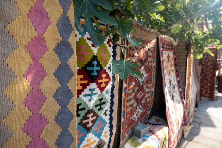 National carpets with Caucasian patterns are for sale in the old town on old stones
