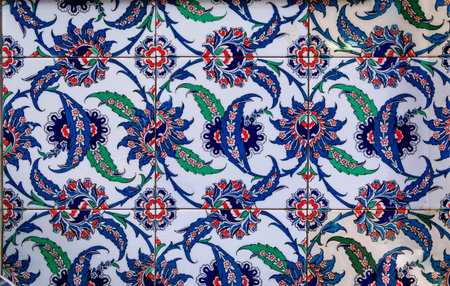 National Turkish ornaments on ceramic tiles on the wall of a mosque in Istanbul. Turkey
