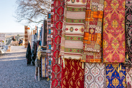 Handmade woven bedspreads in traditional Turkish style are sold at a street market