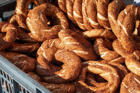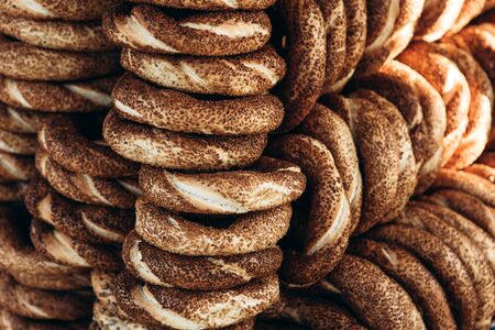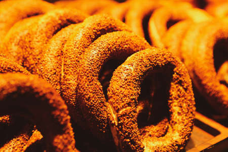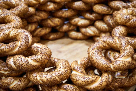 Close up of many traditional turkish bagels called simit. Traditional street food.