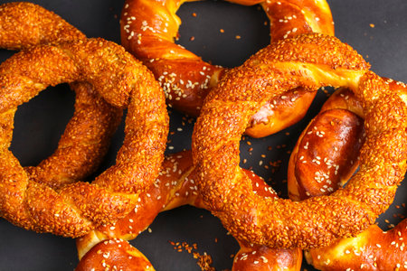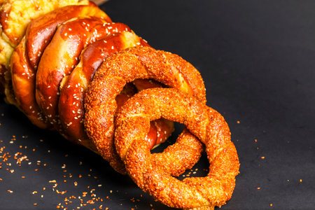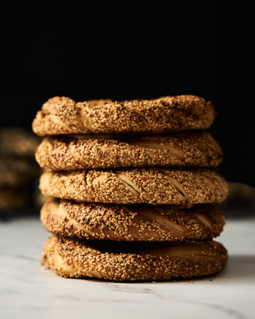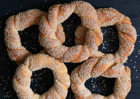 Close up ofTurkish simit bread pretzels stack. Homemade Sesame bagel on dark background. Low key, dark photo
