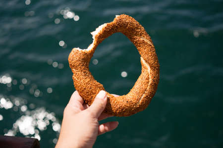 cropped view of young woman holding turkish sesame bagel near bosphorus strait