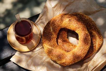 Traditional Turkish sesame bagel simit and Turkish tea on wood background with hard sun light shadows on street.Top view.
