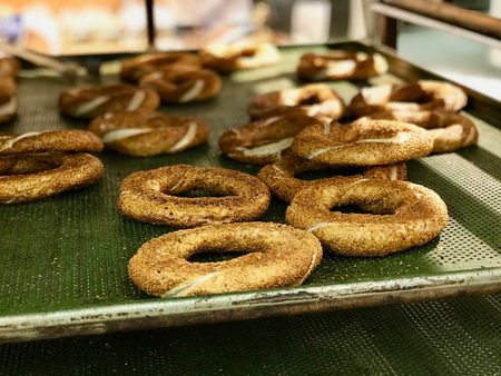 Turkish Pastry Bagel Simit on Tray. Traditional Bakery.