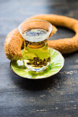 Glass of tea and traditional turkish snack - simit, on dark wooden table