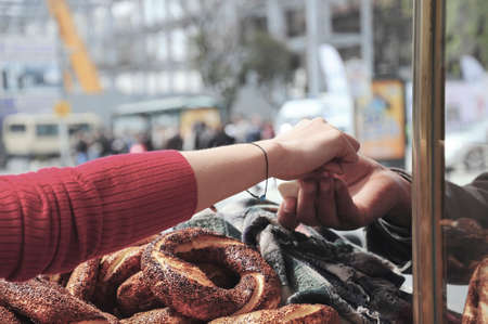 A female hand giving money to get Turkish bagel at street in Istanbul, Turkey