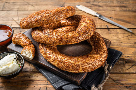 Turkish fast food bagel called Simit. Turkish bagel Simit with sesame. Bagel is traditional Turkish bakery food. English name; bagel - crispy