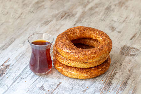 Turkish Bagel Simit with Turkish Tea on Wooden Table. Traditional Food.