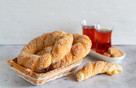 Traditional delicious Turkish food - bagel Simit with hot tea and cane sugar