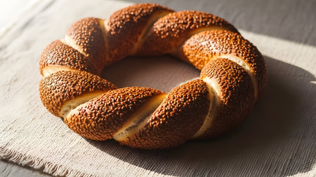 A freshly baked, golden-brown Simit, a traditional Turkish sesame bagel, sits on a textured beige cloth. The circular bread is heavily encrusted with sesame seeds and bathed in natural light, showcasing its crispy crust.