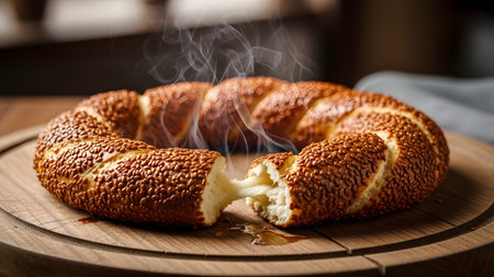 A close-up of a freshly baked Turkish Simit bagel covered in sesame seeds, broken apart to reveal a warm, stretchy cheese pull. Steam rises from the soft, fluffy interior of the pastry, contrasting with the golden-brown crust on a rustic wooden surface.