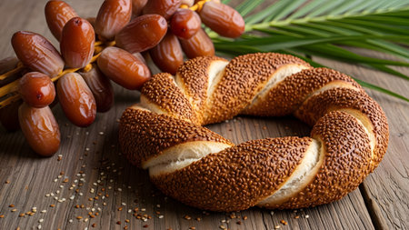 A fresh, sesame-covered Simit bread ring sits on a wooden surface next to a cluster of ripe dates on the branch. This still life composition represents traditional Middle Eastern or Mediterranean cuisine and breakfast staples.