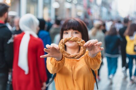 Beautiful young girl in fashionable clothes shows Traditional Turkish street food simit or bagel in English at a busy steet with people at background.