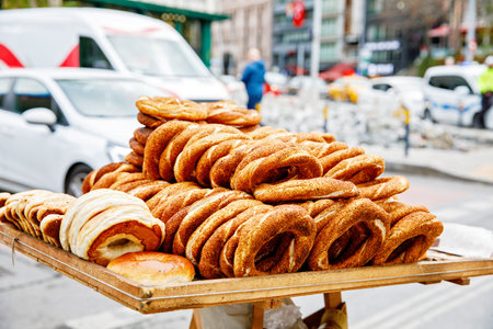 Closeup view of simit (circular bread) on a street vendor cart in Sultanahmet Square, Istanbul, Turkey. Simit is a popular street food among tourists and residents in Turkey.