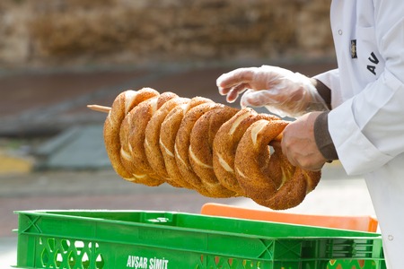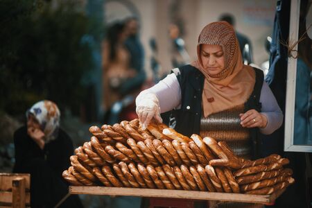 TURKEY, ISTANBUL, DECEMBER 14, 2018: Sale of Turkish Simit bagels in the center of Istanbul