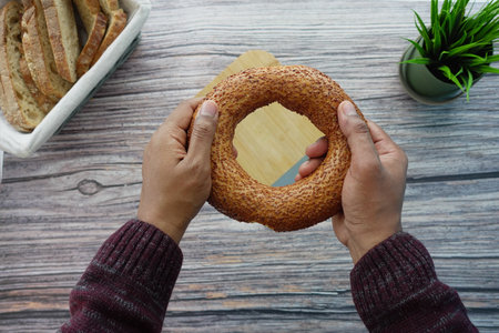 Turkish fast food bagel called Simit. Turkish bagel Simit with sesame. Bagel is traditional Turkish bakery food.