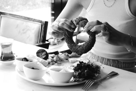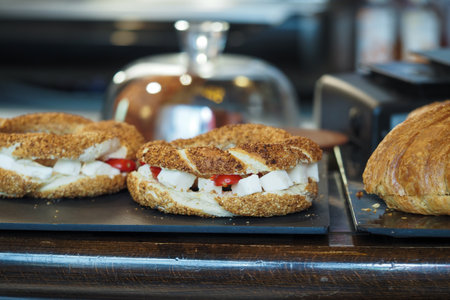 Traditional Turkish breakfast with Turkish bagel with cheese and tomatoes (Turkish name; bagel or crispy)