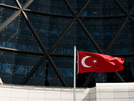 Turkish flag over modern building background. Waving red flag. Turkish patriotism.