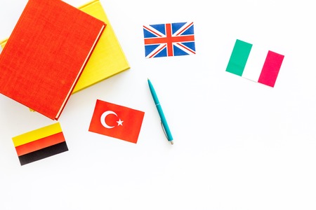 Language study concept. Textbooks or dictionaries of foreign language near flags on white backgrond top view copy space