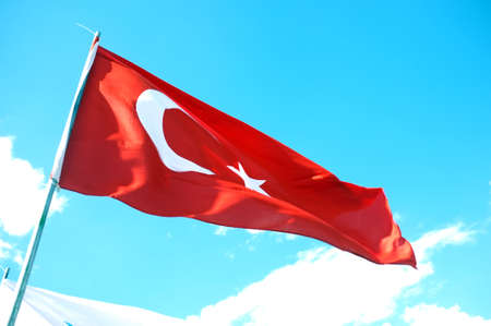 View of red and white Turkish flag with a moon and star on bright blue sky background.