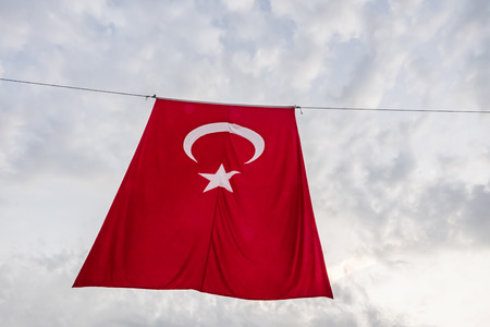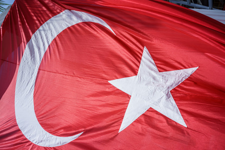 Turkish flag waving in the wind against the background of the sky. White crescent moon and star on red turkish flag