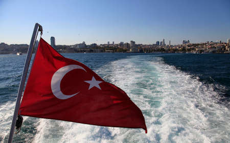 Boat view of the national flag of Turkey and the coastline of Istanbul during the Bosphorus cruise