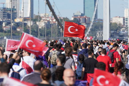 ISTANBUL, TURKIYE - NOVEMBER 05, 2023: Athletes running witg flags in 45. Istanbul marathon which includes two continents in one race.