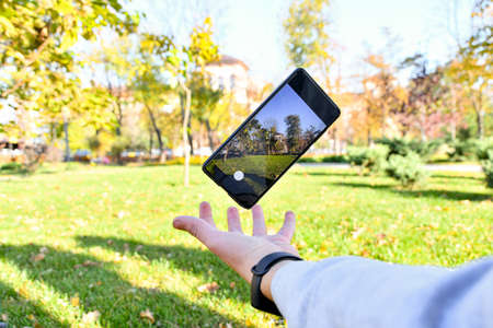 A female hand holding an mobile Phone trying to capture the awesome colors of autumn in the forest. Fall Getaway