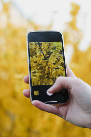 taking photo of yellow blossoming forsythia in the garden in spring.